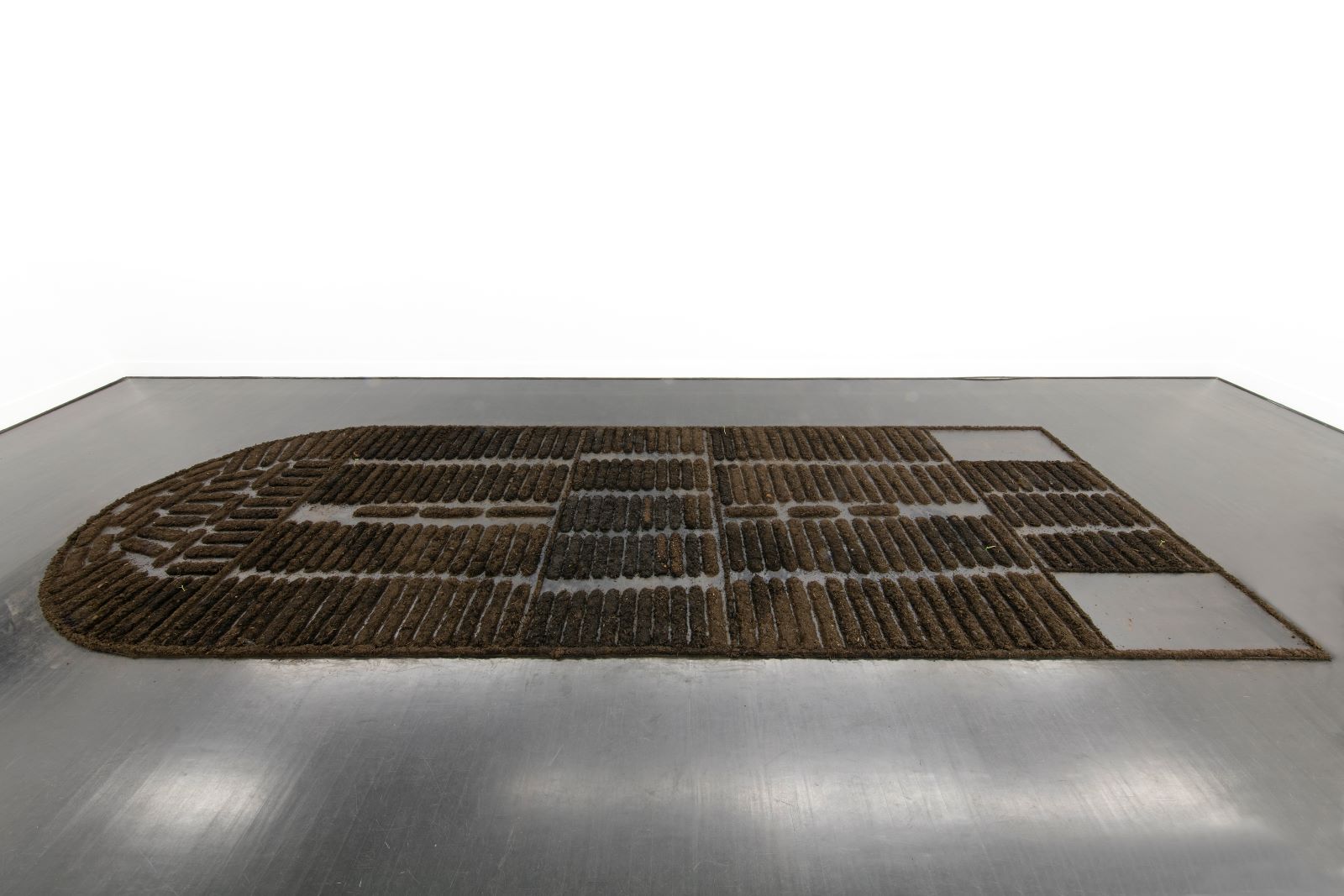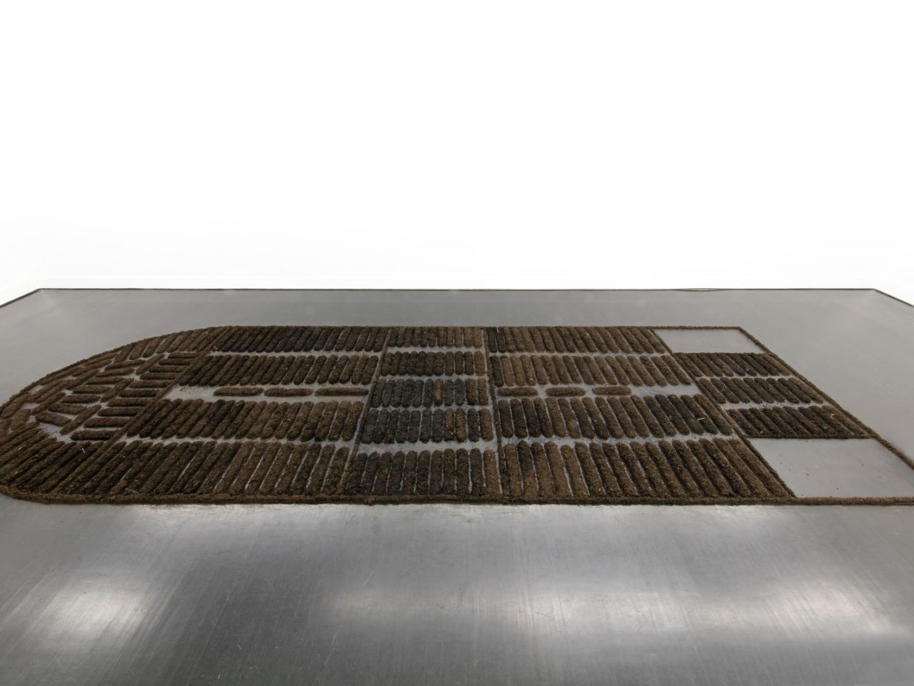 Drawing on the artist’s interest in hidden histories and archival material, Binta Diaw’s reimagining of her installation ‘Chorus of Soil’ (2023) uses soil and seeds to map an 18th century plan of the Brooks slave ship. Between 1782 and 1804, the Brooks departed from Liverpool to the West Coast of Africa, carrying over 5000 enslaved people to plantations in the Caribbean. Reimagined here on an almost 1:1 scale, the soil and seed plan is accompanied by a new sound work incorporating the voices of local people reciting the poem ‘Zong!’ (2008) by M. NourbeSe Philip. Together, the two elements of this ambitious installation speak to collective acts of mourning, hope, resistance, reparation, care and celebration of ancestral wisdom. The material