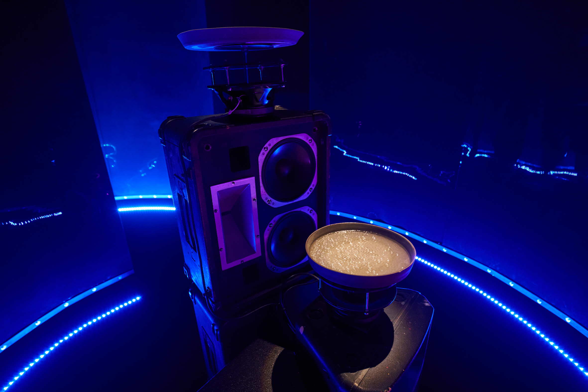 Black Obsidian Sound System present a newly commissioned audio-visual installation at FACT Liverpool. An immersive environment, combining film, light, a sound score and sculpture, the work is an extension of a new short film project A Collective Hum (2019) by B.O.S.S, commissioned by LUX. Weaving together archival images, the installation reflects the ways in which marginalised groups have developed methods of coming together against a background of repression and discrimination in the UK – positioning sound culture as spaces of collective strength and encounter where kinship is found and reciprocated. Grounded in their interest in sound systems, Black Obsidian Sound System consider the speaker as a totem for creating a sacred space, where one can be moved and experience collective pleasure and healing.