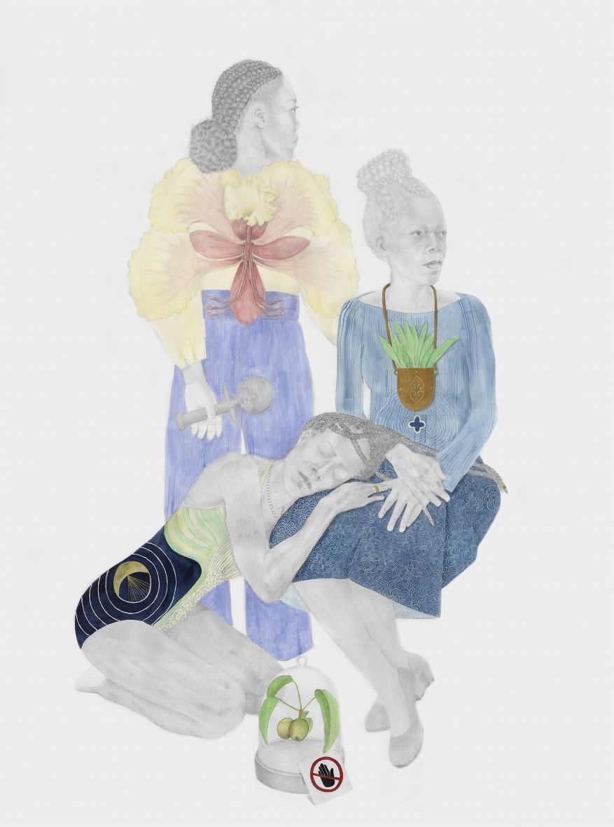 She creates narratives primarily through research connected to the African Caribbean diaspora, which is then mapped onto female figures. She draws herself as a conduit to relay stories which speak about a collective experience; starting with an idea, then allowing intuition and a dialogue with the work to take over. Her practice addresses themes including, ritual, tradition, ancestry, mythology and cosmology. Since her first gallery solo show The Seed Keepers in 2021 with Tiwani Contemporary; Charmaine has been investigating the herbal healing traditions of Caribbean women, especially those of her mother’s generation, and connecting those traditions through colonisation back to their roots in Africa. Her recent 6 week residency in Charente south west France at Launchpad LAB; enabled her to explore nature and ecology in a more focussed way and to combine drawing with making sculptural forms.