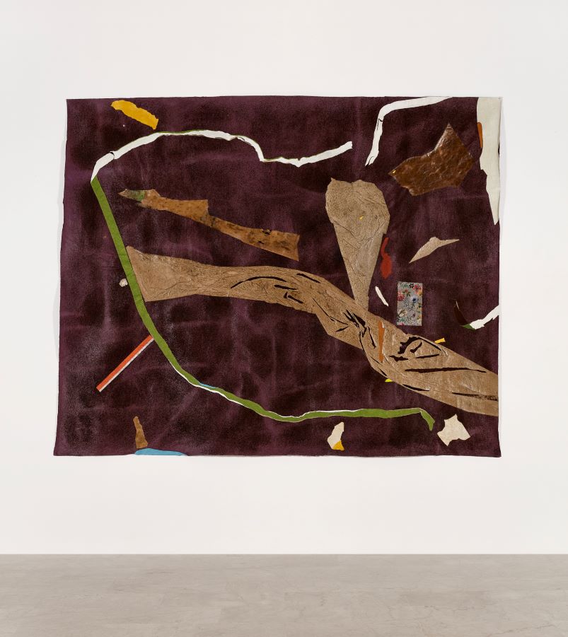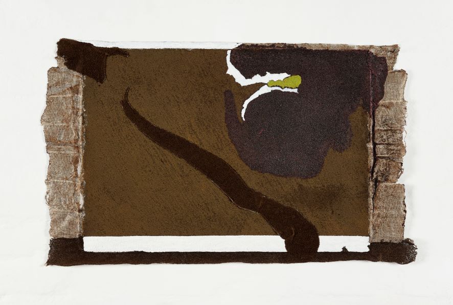 Francis Offman proposes a meditation on the Rwandan genocide, an intimate reflection on how to convey history’s violent narrative through objects of personal connection. ‘Untitled’ is centred around a Bible belonging to Offman’s mother which accompanied her as she fled the country with her family following the onset of the Rwandan Civil War. The floor is filled with books, each delicately held up by callipers – instruments used by Belgian colonisers to measure the facial features of Rwandan people and classify them into racial groups. This immense violence is juxtaposed against the daily pleasure of drinking coffee – a major export of Rwanda – with repurposed grounds spread on the fabric and covering the books. The dialogue between these objects