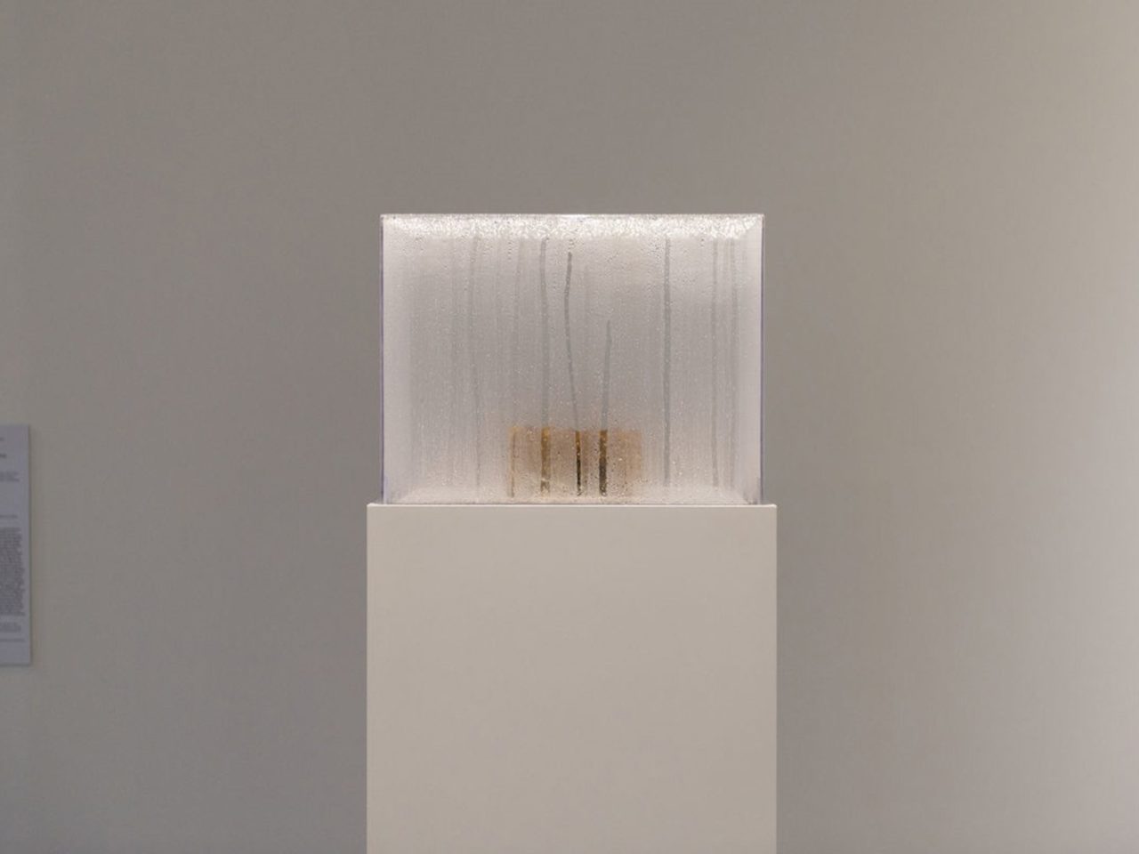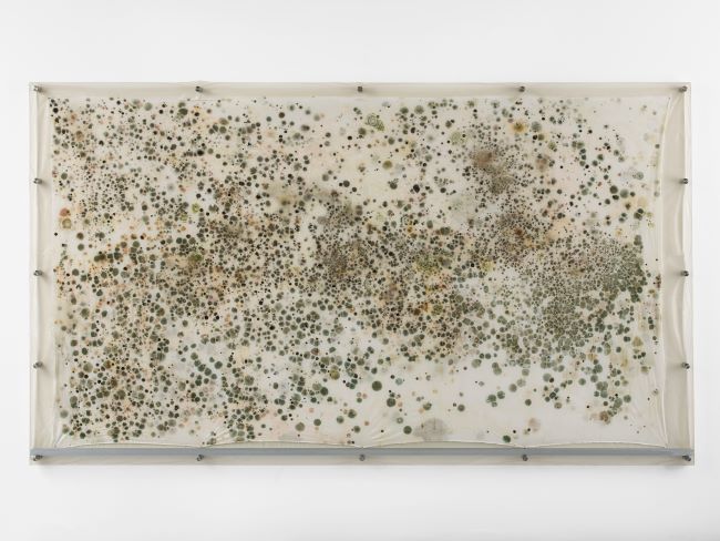 Gala Porras-Kim’s work questions the museum storage system, investigating institutional frameworks and the ethics of keeping and caring for objects. In ‘Out of an instance of expiration comes a perennial showing’ (2022 – ongoing), Porras-Kim propagates mould spores from the British Museum’s collection storage, liberating and regrowing microscopic parts of the exhibits and artefacts. The work is a living organism. The mould spores will grow and spread over the course of the exhibition, inverting traditional concerns within conservation which aim to prevent and contain growth.