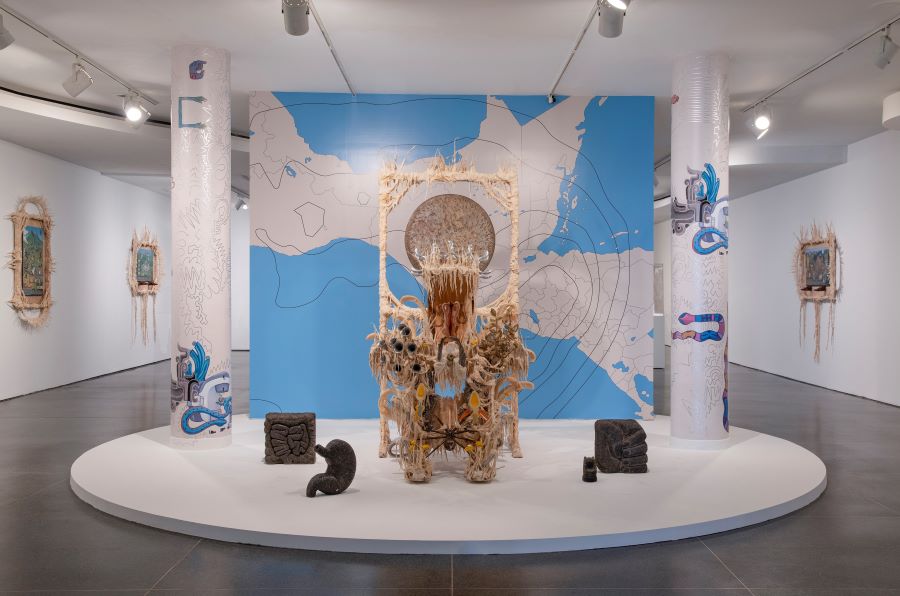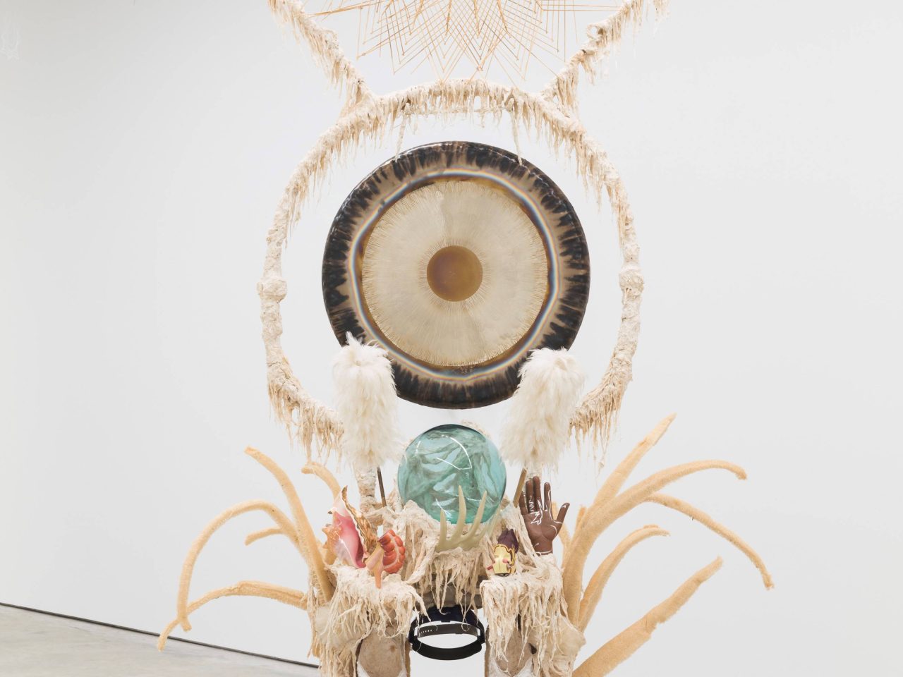 Guadalupe Maravilla’s ‘Disease Thrower’ series (2019) are autobiographical constructions which are at once sculptures, shrines, wearable headdresses, and healing instruments, reflecting on the artist’s own experiences as an undocumented migrant and cancer survivor. Elements of the work are crafted from objects collected during Maravilla’s retracing of his childhood migration route made alone to the USA at the age of 8 to escape the civil war in El Salvador, interwoven with items from the spiritual and shamanic practices the artist experienced after his diagnosis with colon cancer in his mid-30s. The works consider ancient and contemporary methods of healing the body and spirit from the traumas of displacement. The artist works with healers of all types to activate the works during sound ceremonies which include gongs, singing, flutes, harmonicas and many other types of sound instruments. Showing at Tate Liverpool