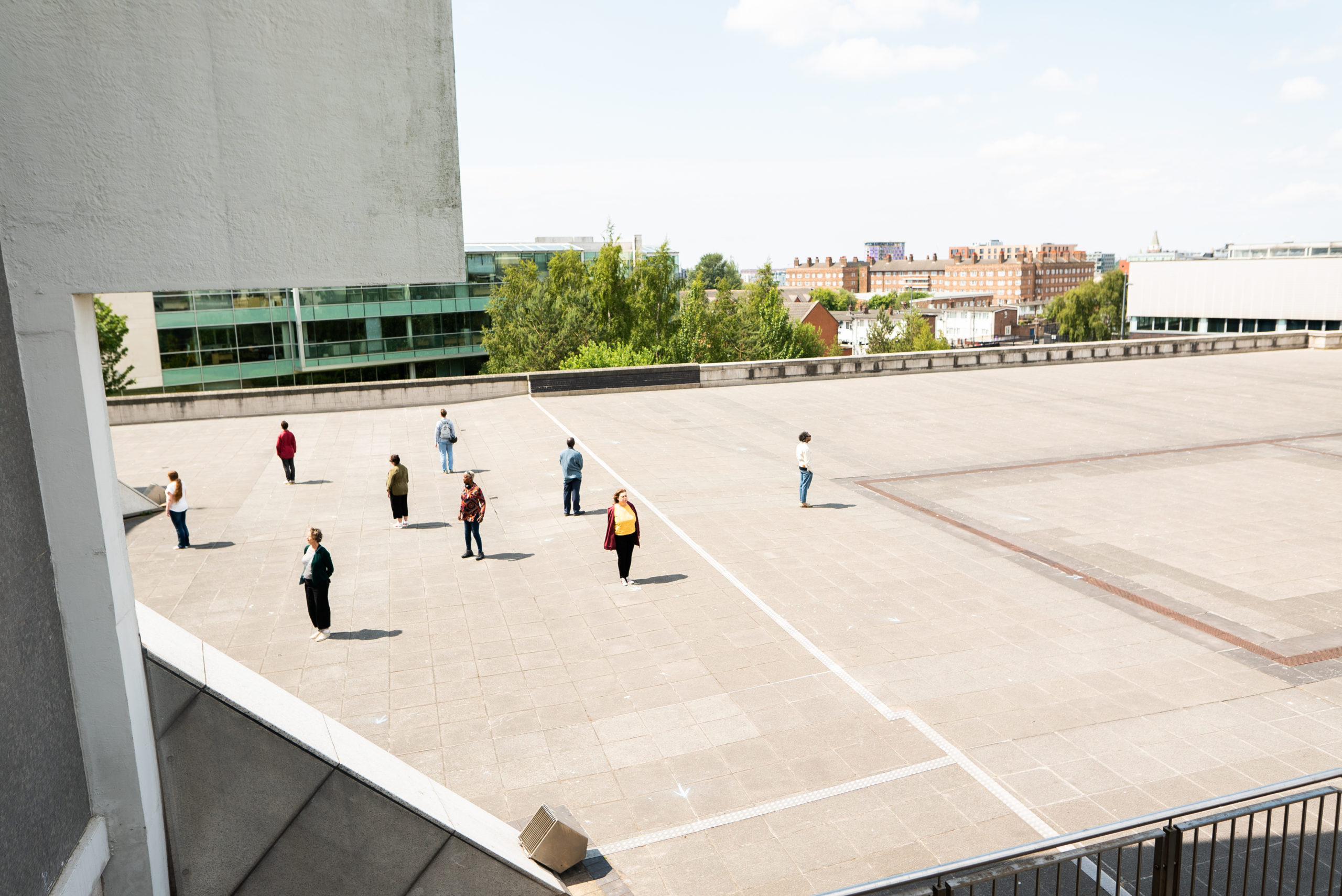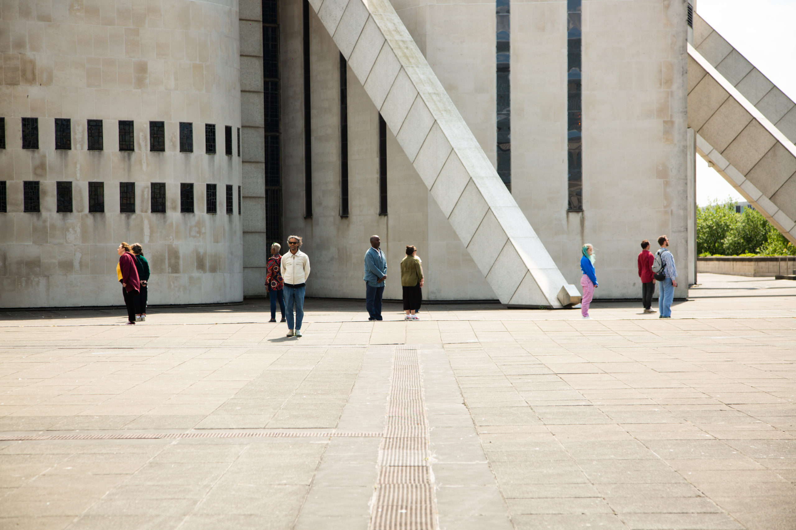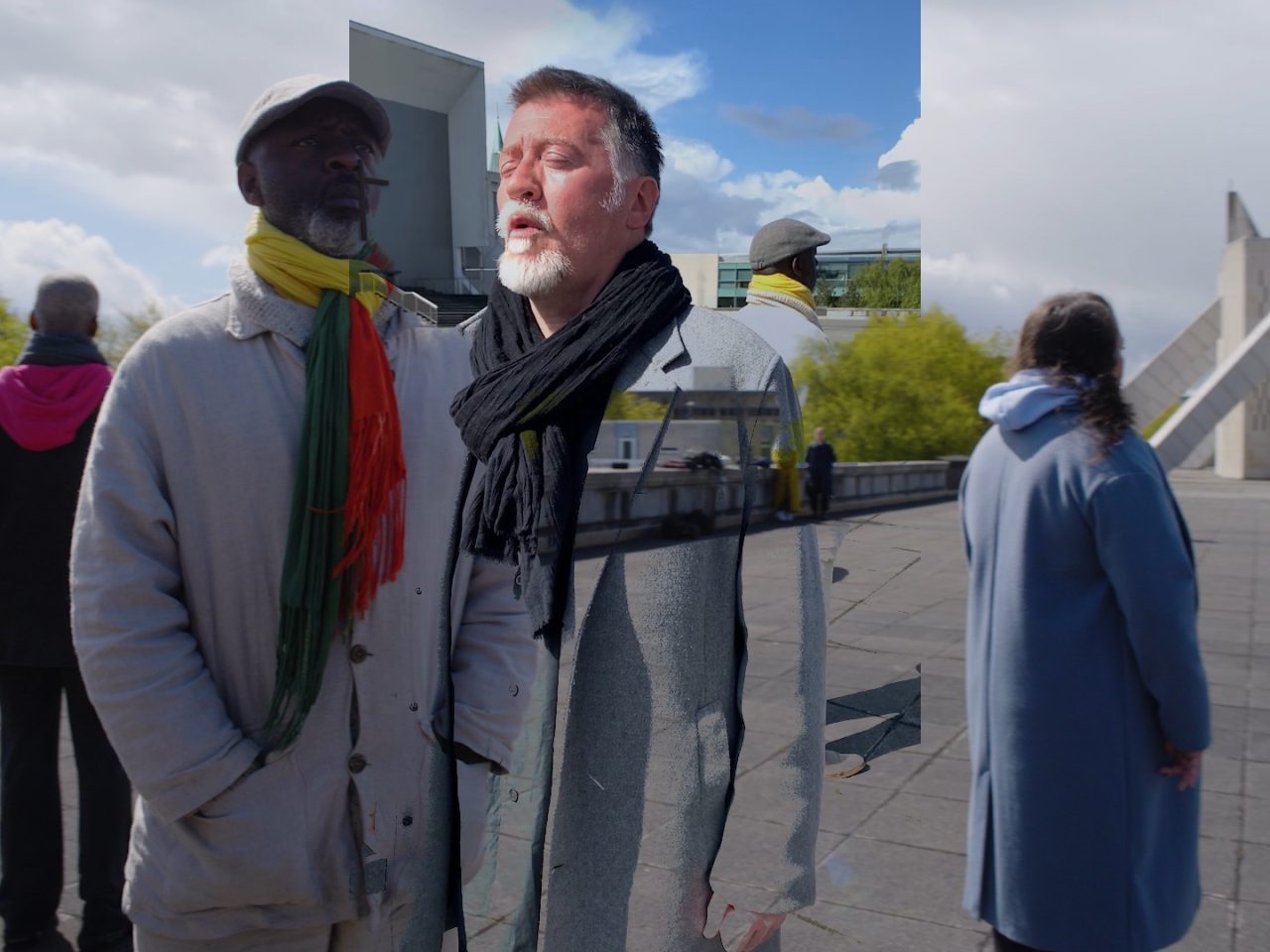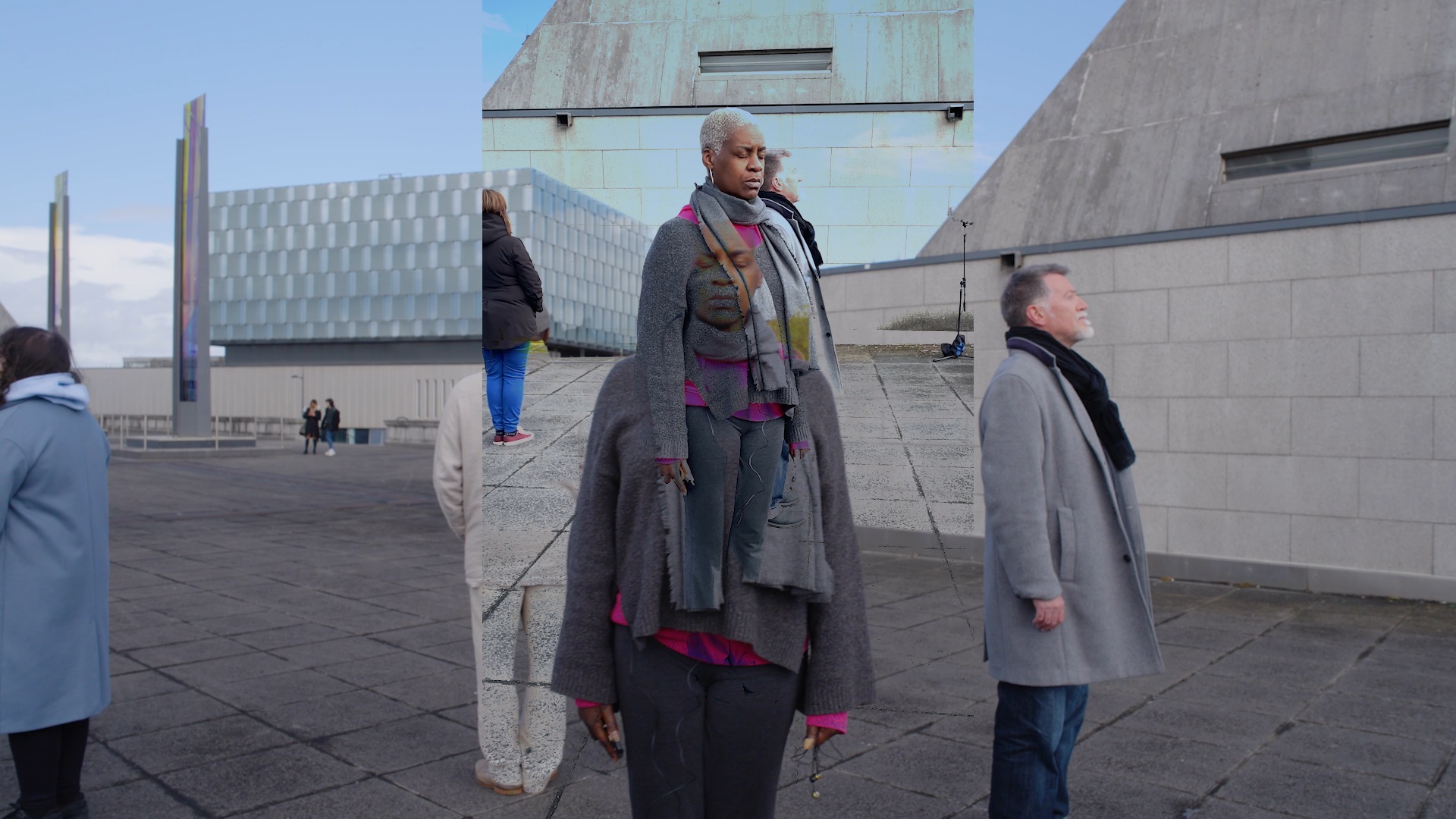‘The Three ///’s’ (2021) explores social gatherings and ritual and is informed by the Fibonacci sequence and golden ratio – a mathematical phenomenon visible throughout nature and often applied in classical art. This performance, featuring Liverpool based singers, was documented with the resulting footage forming the central element of the new three-part video work. In collaboration with Mirza, Jennifer John led the ensemble of composers and performers made up of Anne Taft, Emma Bispham, Jennifer John, Steve Boyland and Tayo Aluko in order to evolve the vocal interpretations of the ritual.