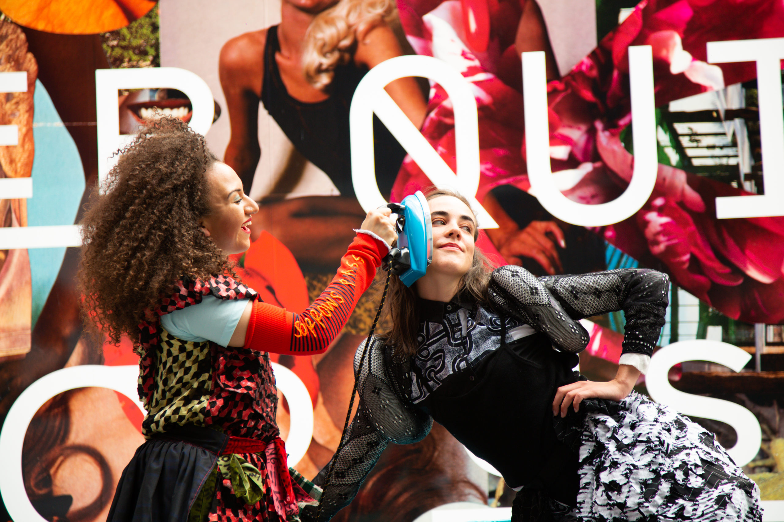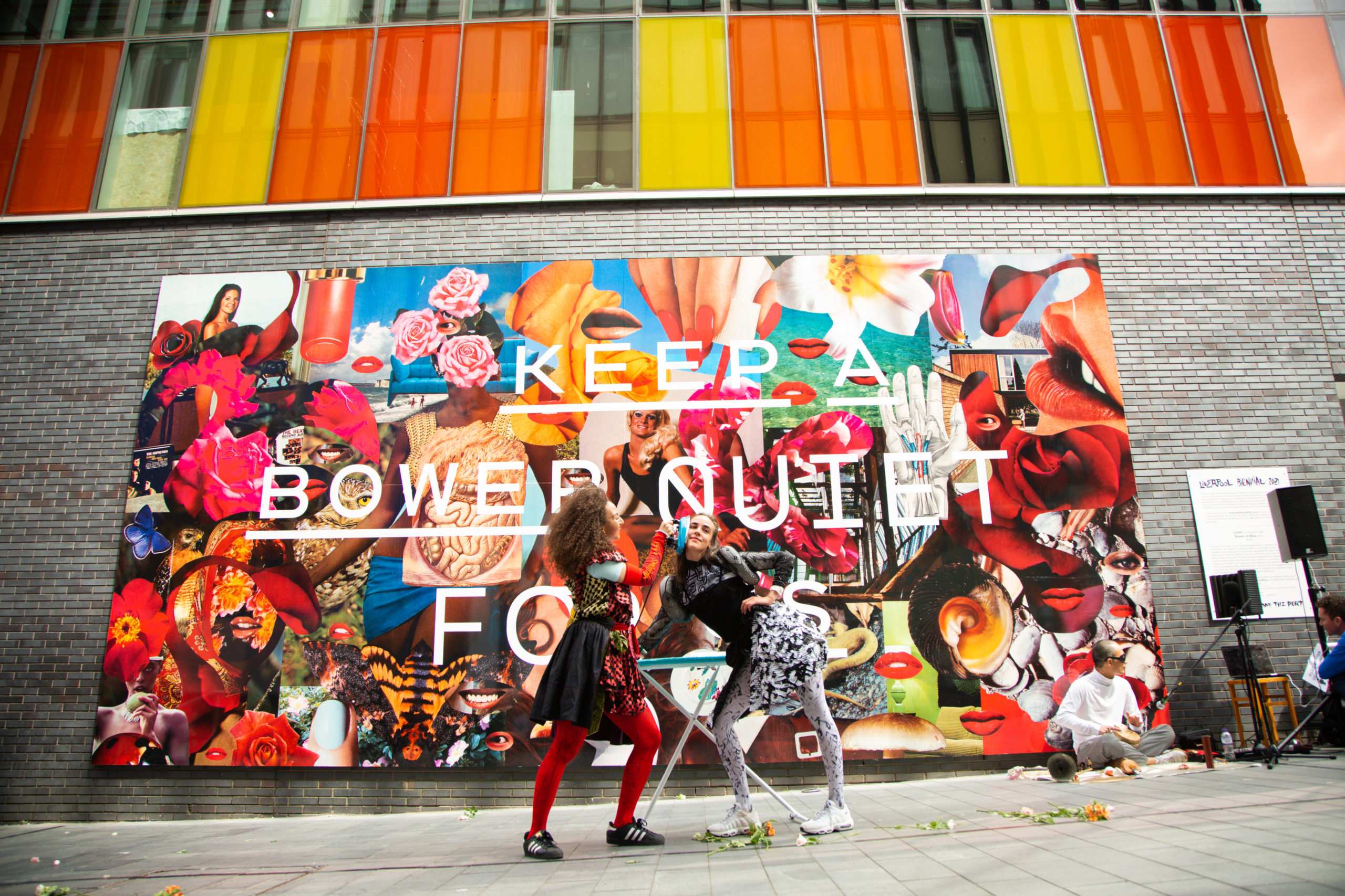 Linder presented a series of photomontage works at Tate Liverpool and a new street-level billboard commission within Liverpool One. Drawing on feminist critiques around the commodification of the female body in society, Linder’s photomontage works challenge contemporary and historical depictions of women in the public eye by combining everyday images from domestic or fashion magazines with pornographic imagery and other archival materials. Linder’s new large-scale billboard commission forms part of her ‘Bower of Bliss’ (2021) constellation that has its origins in a copy of Oz magazine, which she bought at the Bickershaw Festival in 1972. The centuries old phrase “Bower of Bliss” refers to the birthplace, the point of origin and safety. For the poet Edmund Spenser, the “Bower of Bliss” meant “womb”. For Linder, the connotations link back to her experience of being carried in her mother’s womb in Liverpool in 1954 and her billboard presents the “Bower of Bliss” as a safe, deeply pleasurable space, needed now more than ever. Visitors could interact with the mural by taking a photo or selfie to share via social media using #BlowerofBliss The mural developed over festival dates, with text reading “Bower of Bliss” being added at a later stage. Linder’s public work also featured as part of Liverpool Biennial’s Live Weekend (19–20 June), with a series of dance performances taking place in front of the billboard. The activations comprised of an improvised routine by local dancers Lauren Fitzpatrick and Kirstin Halliday in response to music by composer and musician Maxwell Sterling – extending the key concepts and themes of Linder’s works. Costumes designed by Louise Gray. Bower of Bliss is commissioned by Liverpool Biennial with support from Liverpool ONE and The Estate of Fanchon Fröhlich.
