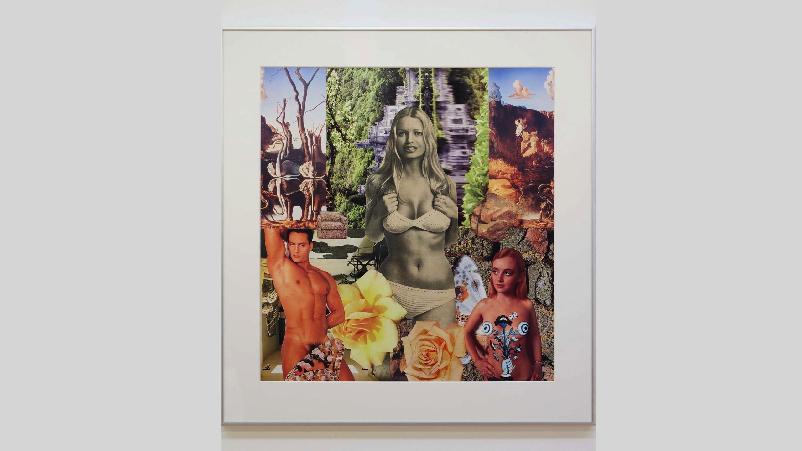 Linder presented a series of photomontage works at Tate Liverpool and a new street-level billboard commission within Liverpool One. Drawing on feminist critiques around the commodification of the female body in society, Linder’s photomontage works challenge contemporary and historical depictions of women in the public eye by combining everyday images from domestic or fashion magazines with pornographic imagery and other archival materials. Linder’s new large-scale billboard commission forms part of her ‘Bower of Bliss’ (2021) constellation that has its origins in a copy of Oz magazine, which she bought at the Bickershaw Festival in 1972. The centuries old phrase “Bower of Bliss” refers to the birthplace, the point of origin and safety. For the poet Edmund Spenser, the “Bower of