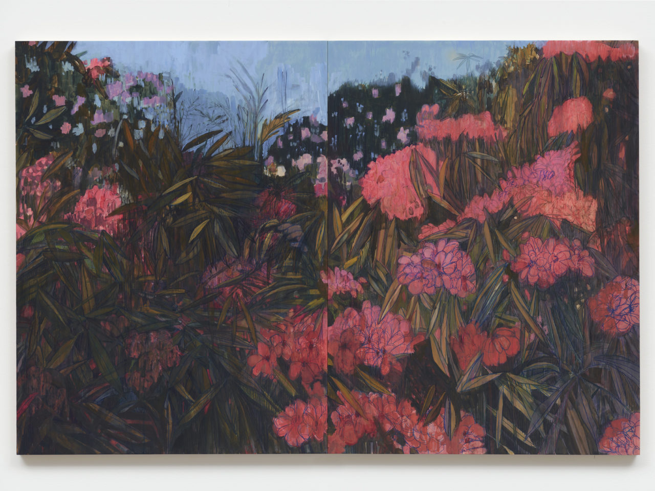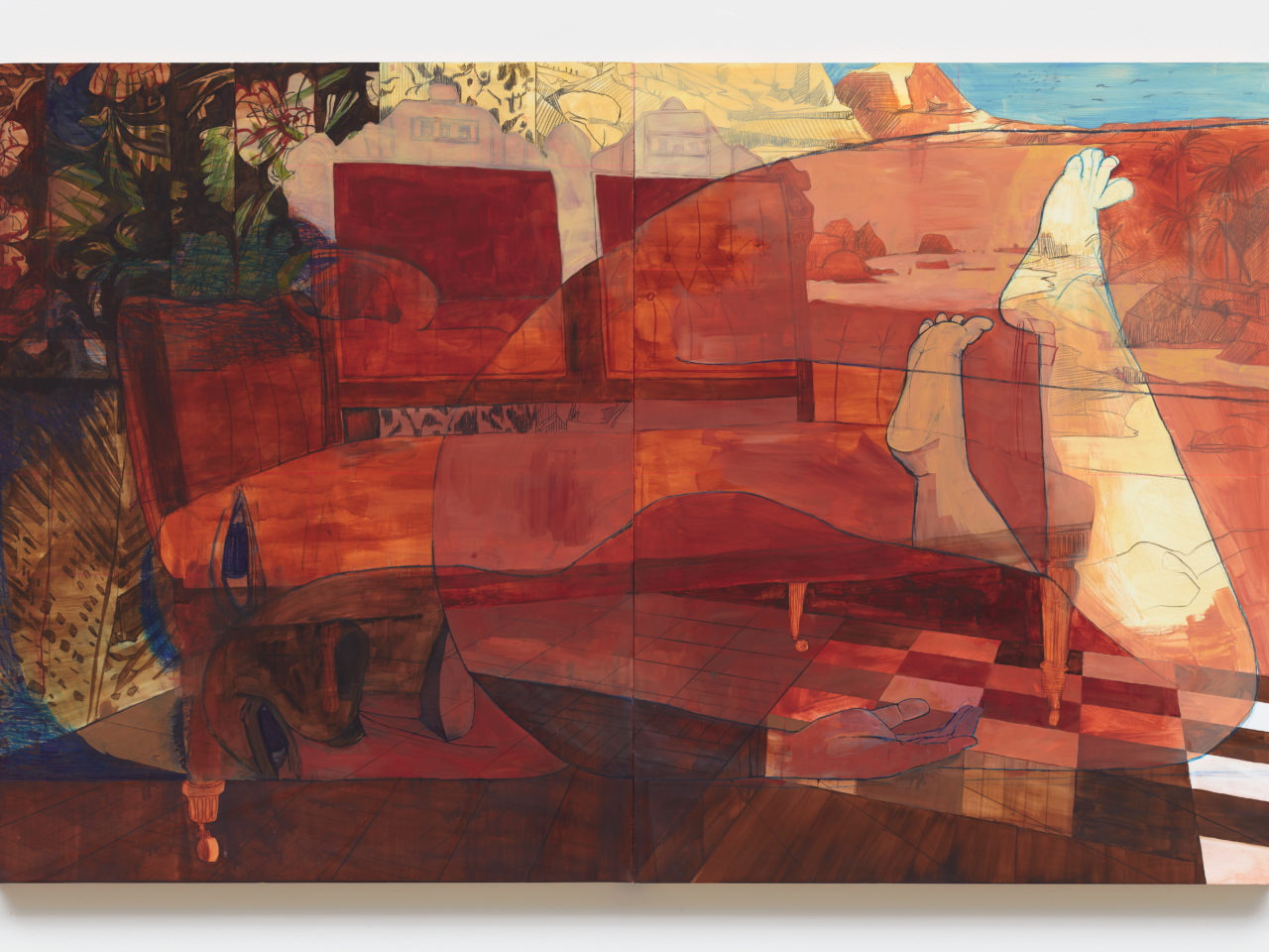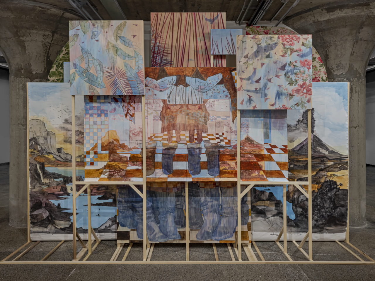 Pamela Phatsimo Sunstrum’s multidisciplinary practice encompasses drawing, painting, installation and animation. Her work alludes to mythology, geology and theories on the nature of the universe. Sunstrum’s works make reference to literature, film, theatre, and other forms of storytelling to build an ever-expanding narrative. These ongoing sagas unfold within terrains that appear simultaneously futuristic and ancient: a patchwork of remembered landscapes from her upbringing in places such as Botswana, Canada, Sudan, Sri Lanka, Malawi, Panama, and others. The characters in her work stand as a collective: a nebulous cast of bodies in constant flux amidst ever-slipping and insufficient notions of self-hood and belonging.
