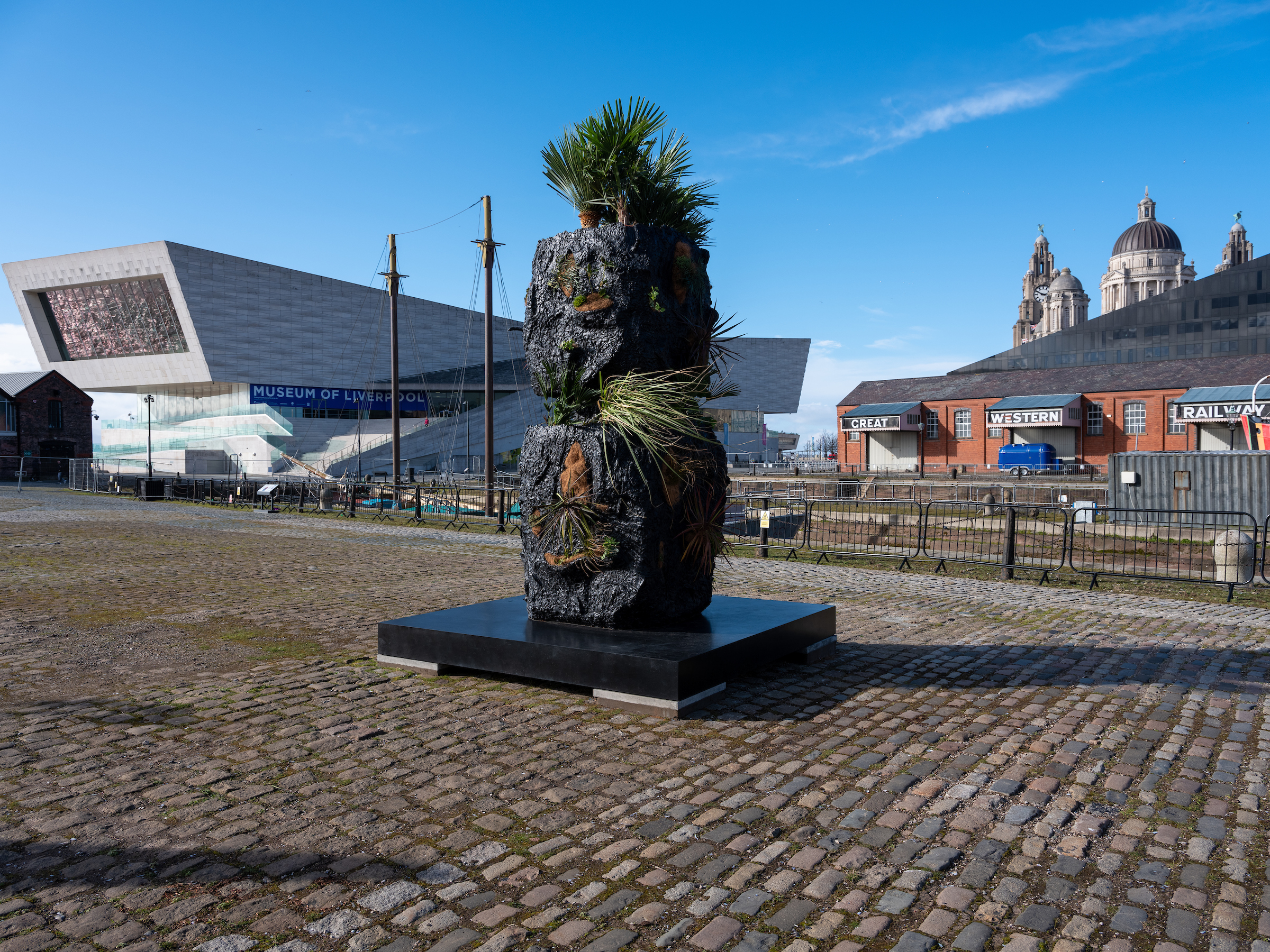 Rashid Johnson presented a large-scale public sculpture titled ‘Stacked Heads’ (2020) at Canning Dock Quayside. Johnson’s sculpture is formed by two distinct head parts in the style of a totem – made from bronze and furnished with plants. The sculpture takes inspiration from his series Anxious Men (2015-ongoing), which evokes a sense of collective anxiety. Incorporating organic elements in his work, the plants which grow from within the sculpture – yucca and cacti – were selected for their endurance to harsh winds and saline water. The plants resilience and the placement of the work at a waterfront location negotiated Liverpool’s transatlantic histories while keeping prescient contemporary concerns at its core.