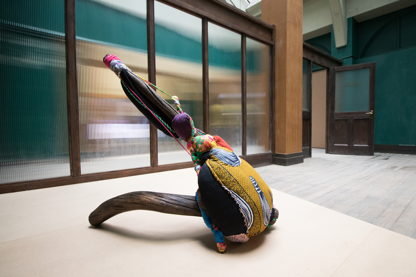 Sonia Gomes presented four fabric sculptures at the Liverpool Cotton Exchange Building. Gomes constructs her structures using only materials that have been handed to her by others – taking on errant leftovers and combining them to create sites of intense encounter and entanglement. Mainly consisting of second-hand clothing and wires, Gomes’s transformation of disowned and unwanted materials gives them a new significance and life. The sculptures metaphorically bear the memories of the materials’ original owners, tying together their collective consciousness to create a knotty and guttural form. Gomes trusts that every material is imbued with latency of life, imagining her sculptures as bodies that absorb and retell the multiple memories of the ‘Other’.