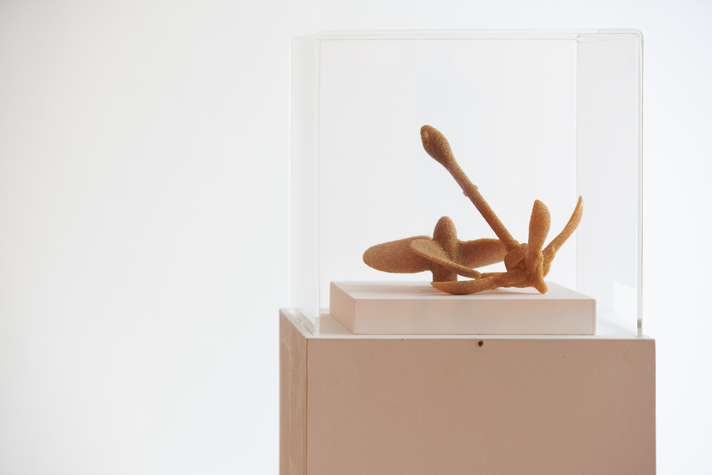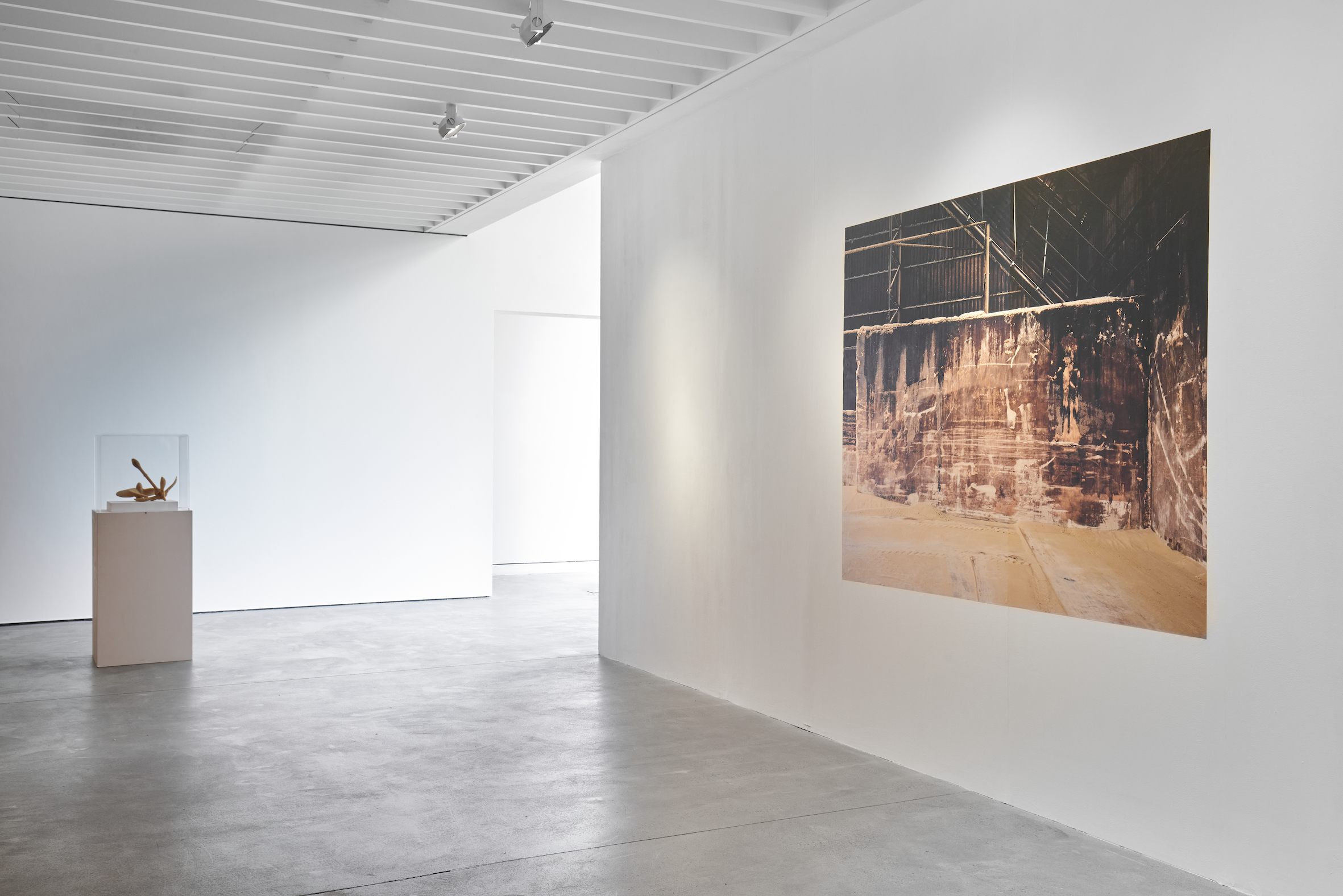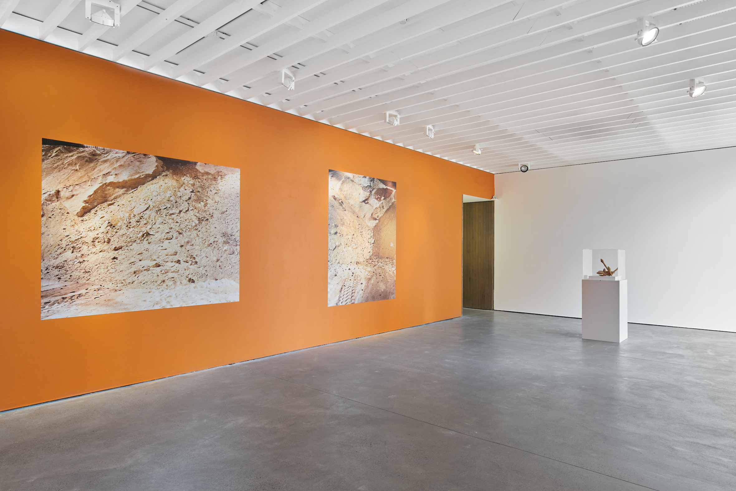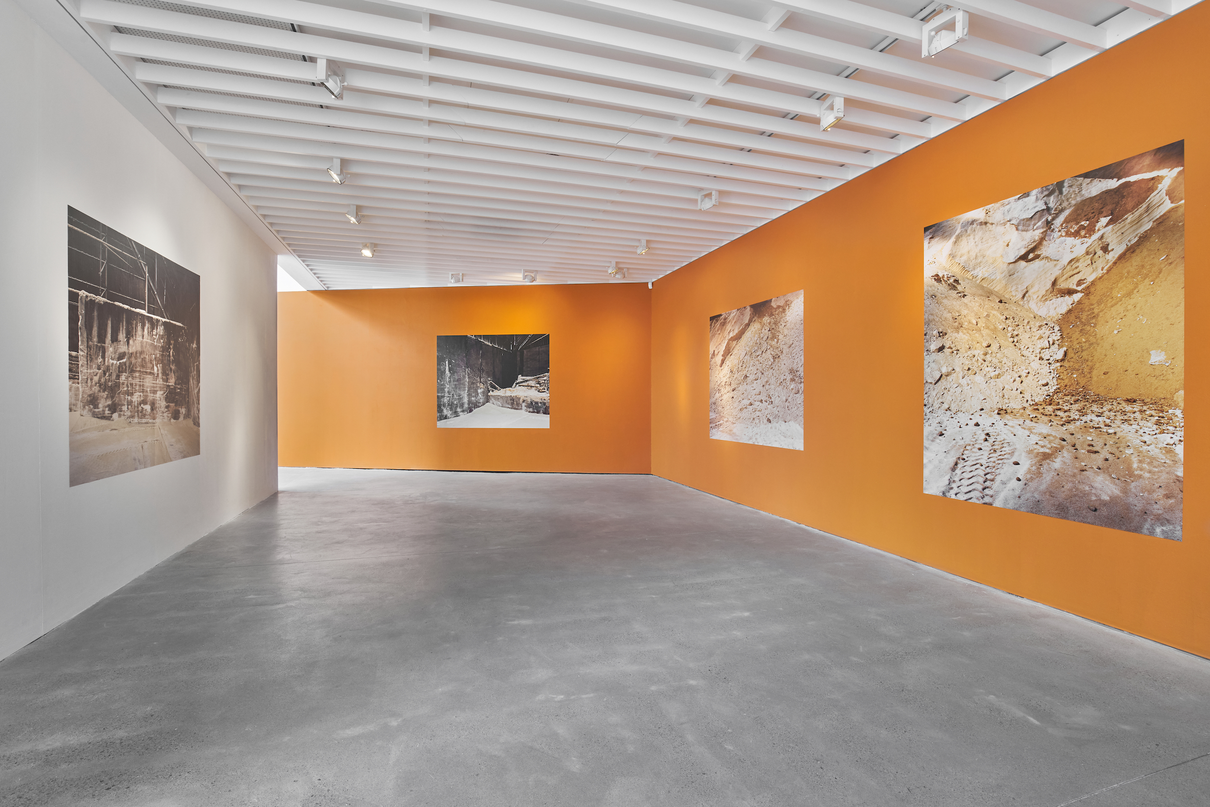 Zineb Sedira presented a set of prints and sculptures from her ‘Sugar Routes’ (2013) series at Open Eye Gallery. Sedira’s works recount the history of transoceanic human migration, the triangular trade routes of the eighteenth and nineteenth centuries and the continued trade of sugar across the Atlantic for mass consumption. Working in a contemporary context, Sedira’s photographic prints depict sugar extracted from different parts of the world housed in a modern warehouse in the French port city of Marseille. The mountainous piles of sugar present a landscape of extraction where multiple geographies convene and merge with one another; the warehouse becoming an in-between space of encounter before the sugar is processed for consumption. Juxtaposed a sculpture of an anchor made from cane sugar found in the French silo, the works act as a metaphor for migration and diaspora. The series was originally commissioned by Marseille Provence 2013, European Capital of Culture and the Port of Marseille.