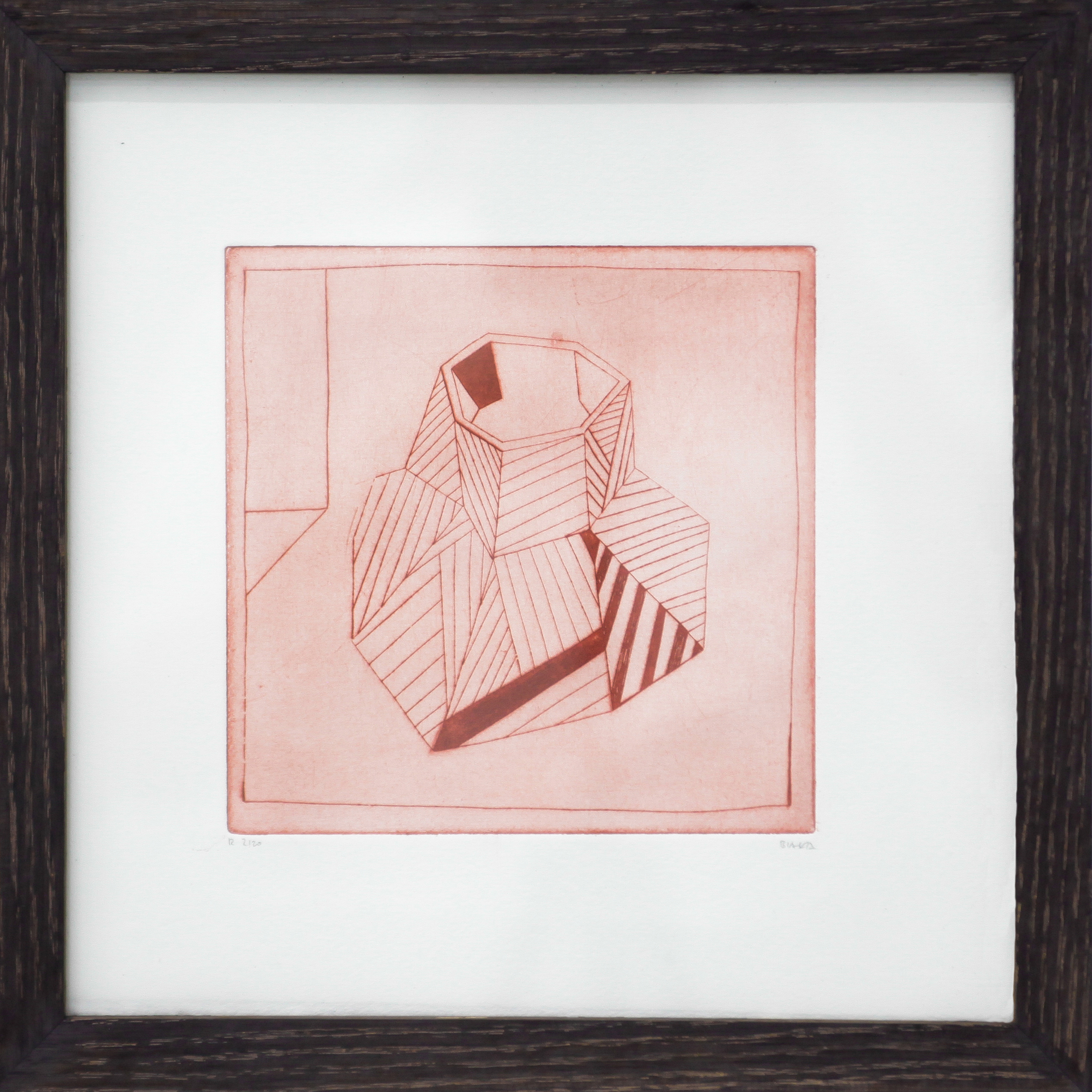 Biala’s Totemy Composition One etching showcases the geometric patterns found in the public realm sculpture. Biala chose to create the etching plate using the same metal found on the sculpture. The etching has been created using brass colouring, symbolising the rust effect located on the sculptures. This etching celebrates the materials, colours and shapes of its sculptural counterpart within a medium that forms a part of Biala’s practice.